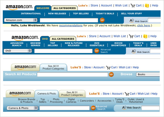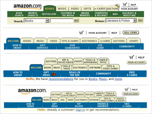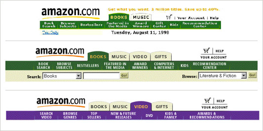 В 1998 году у сайта были только две категории верхнего уровня: книга и музыка. По мере того, как появлялись новые категории (видео, подарки), навигационная панель расширялась и весьма неплохо масштабировалась, позволяя даже каждую категорию товаров выделить своим собственным цветом.