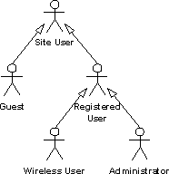 На представленном выше рисунке изображены несколько групп пользователей (называемые на языке UML "исполнителями" (actors), которые будут работать с web-сайтом. В данном случае самый общий тип пользователя ("Пользователь сайта" - Site user) расположен вверху диаграммы. Сплошная стрелка обозначает отношение обобщения, то есть у нас имеются две более специфические категории пользователей: посетители-гости и зарегистрированные пользователи. Характеристики, которые будут общими у обеих групп пользователей, будут приписаны исполнителю "пользователь сайта", а привилегии, специфичные для посетителей-гостей и зарегистрированных пользователей, будут приписаны более мелкой соответствующей роли. В зависимости от используемой программы, вы можете прямо в диаграмме создавать описания и прикреплять их к определенному исполнителю, т.е. вам нет необходимости создавать отдельно диаграмму и отдельно документы, ее описывающие. В данном приложении помимо прочего пользователи делятся на посетителей, подключившихся к сайту по беспроводной связи, и администраторов. Обе эти группы - дальнейшая подразделение группы зарегистрированных пользователей, в системе у них будут различные функции.