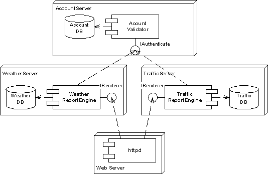 Как было сказано в первой части данной статьи, большинство веб-сайтов не отличаются сложной архитектурой. Однако диаграммы развертывания системы все равно могут представлять для вас интерес по двум причинам: они показывают архитектуру и организацию файлов. Что касается организации файлов, то я предпочитаю работать с инструментами моделирования классов так, как описано в первой части в разделе " Спланируйте страницы ". Здесь же, я упомяну для справки диаграмму компонентов, но в зависимости от сложности сайта вы можете сами решать, нужна она или нет. Следующий ниже пример намеренно использует больше машин (узлов), чем наш простой реальный пример, который вполне уместился бы на одной машине, ну разве что в будущем его понадобилось бы промасштабировать для обслуживания более массовой аудитории.