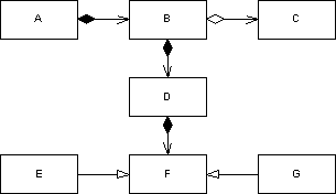 Не зная ничего о назначении каждого из изображенных классов, не разумно давать оценку их целостности. Тем не менее, диаграмма показывает, что отношения между классами изящно сведены к минимуму. Из-за этого легче понять поведение кода. Что более важно, изменения в любом из классов минимально влияют на другие классы (например, изменения в классе D непосредственно затронут лишь класс B). Более того, что получения доступа к классу D разработчику не нужно что-то знать о классах E, F или G. А теперь посмотрите на другой пример и сравните.
