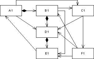 Рис.10: Пример дизайна №2В этом пример дизайна объекты явно слишком сильно сплетены. Изменения в классе D1 потребуют длительных тестов других классов, чтобы проверить, насколько изменения сказались на них. Более того, если вы хотите выполнить какую-то функцию, вам придется гадать, где она спрятана - в самом классе D1 или в его соседях C1, E1 и/или F1.
