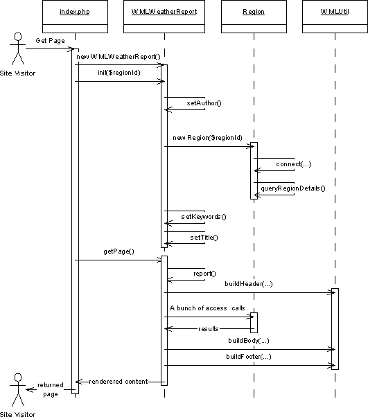 Данная диаграмма взаимодействия показывает дизайн того, как на веб-сайте будет создаваться отчет о погоде. Реальный код, стоящий за диаграммой, можно найти в предыдущей статье - введении в WML (исключая механизм проверки пользователя). Некоторые незначительные методы на диаграмме не присутствуют потому, что я был заинтересован в моделировании ключевых шагов процесса. Вы сами можете проследить выполнение методов от "1" до "1.3.3.4". в некоторых командах принято нумеровать диаграммы как 1, 2, 3, 4, но вообще-то лучше показывать глубину вызовов используя следующую нотацию: 1, 1.1, 1.2, 2, 2.1 и так далее. эта схема нумерации показывает систему передачи вызовов более наглядно. Например, диаграмма показывает, что метод report() вызывает несколько функций в объектах WMLUtil и Region. Функция buildHeader(...) в WMLUtil вызывается до того, как мы начали создавать отчет с помощью других функций. Наконец, мы вызываем метод buildFooter(...) в модуле WMLUtil до того, как возвращаемся к методу report() и из него - к методу getPage(). В диаграммы взаимодействия можно добавлять более подробную информацию, например, тип возвращаемых данных, ограничения на данные и прочие условия.