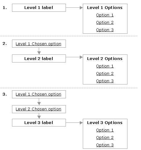 Этот тип навигации являеться комбинацией цепочных ссылок и обычного меню. Он занимает очень мало места и позволяет выводить на экран множество пунктов на каждом уровне.