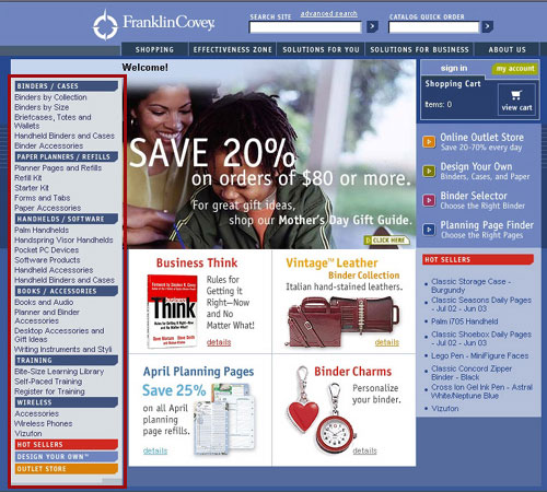 В данном примере демонстрируется компоновка рекламного типа: ссылки на дочерние элементы расположены слева, а центральная часть страницы занята рекламными материалами. [ Закрыть ]