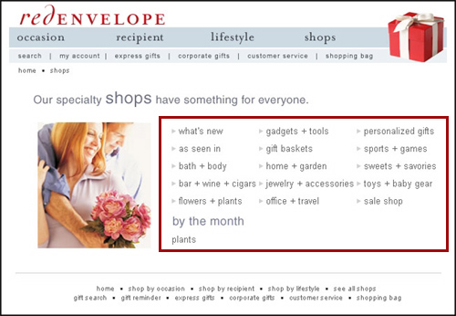 В данном примере ссылки на дочерние элементы расположены в виде трех-колоночного текста справа в центре страницы. Эти ссылки доминируют на странице вместе с фотографией. [ Закрыть ]