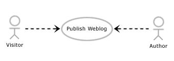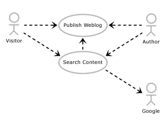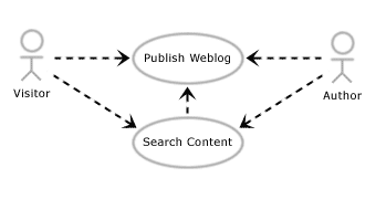 Диаграммы "вариантов использования" помогают думать о проекте в разрезе отношений или взаимозависимостей (dependencies) между "актерами" и тем, что они делают. Например, вполне возможно, что "посетители" (visitors) и "авторы" (authors) хотят иметь возможность отыскать в weblog-e уже опубликованную новость: